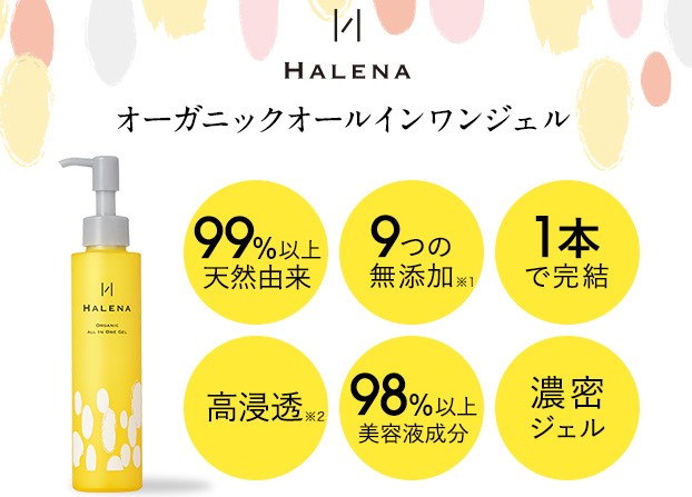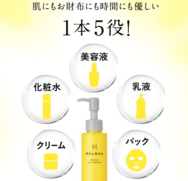 「HALENA オーガニックオールインワンジェル」は、1本で化粧水・美容液・乳液・クリーム・パックの5役を果たすオールインワンタイプのスキンケアジェルです。
