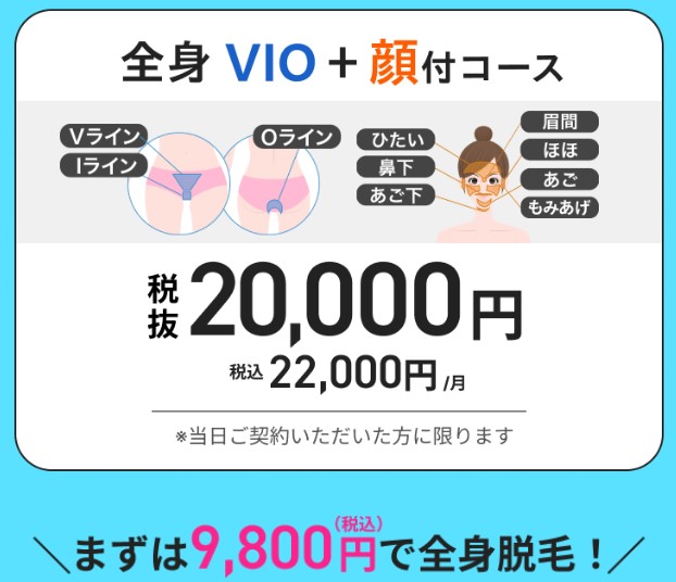 全身脱毛やVIO、顔脱毛などの主要プランがセットになっており、追加費用が発生しにくい設計になっています。